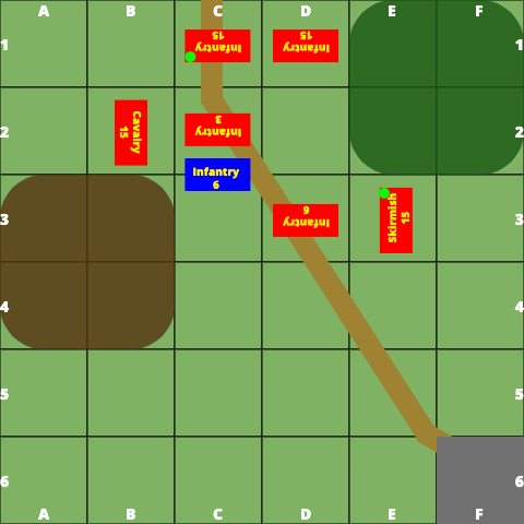 As a side note, in square grid combat you have to attack from F5 and E6. If the attack comes from E5 (which is legal) it essentially makes an implied pivot that 'hides' its left and right flanks (squares E7 and G5).Turn 8 saw the Blue Cavalry charge out and attack the Red Infantry that was attempting to move on its flank. This was a strong move by Shaun because with the Cavalry in E6 and its front facing D5, that puts its right flank in square F5.